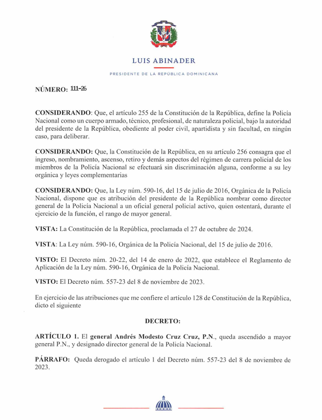 Santo Domingo, R.D. – El presidente de la República, Luis Abinader, dispuso el ascenso del general Andrés Modesto Cruz Cruz, P.N., al rango de mayor general y su designación como nuevo director general de la Policía Nacional, mediante el Decreto núm. 111-26.