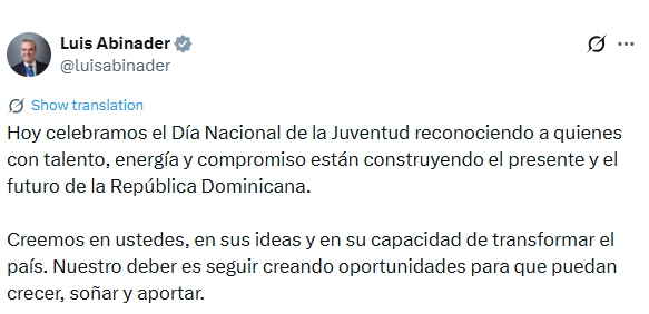 A través de su cuenta en X, el mandatario destacó el papel de la juventud en el desarrollo del país, señalando que los jóvenes, con su talento, energía y compromiso, están construyendo tanto el presente como el futuro de la República Dominicana.