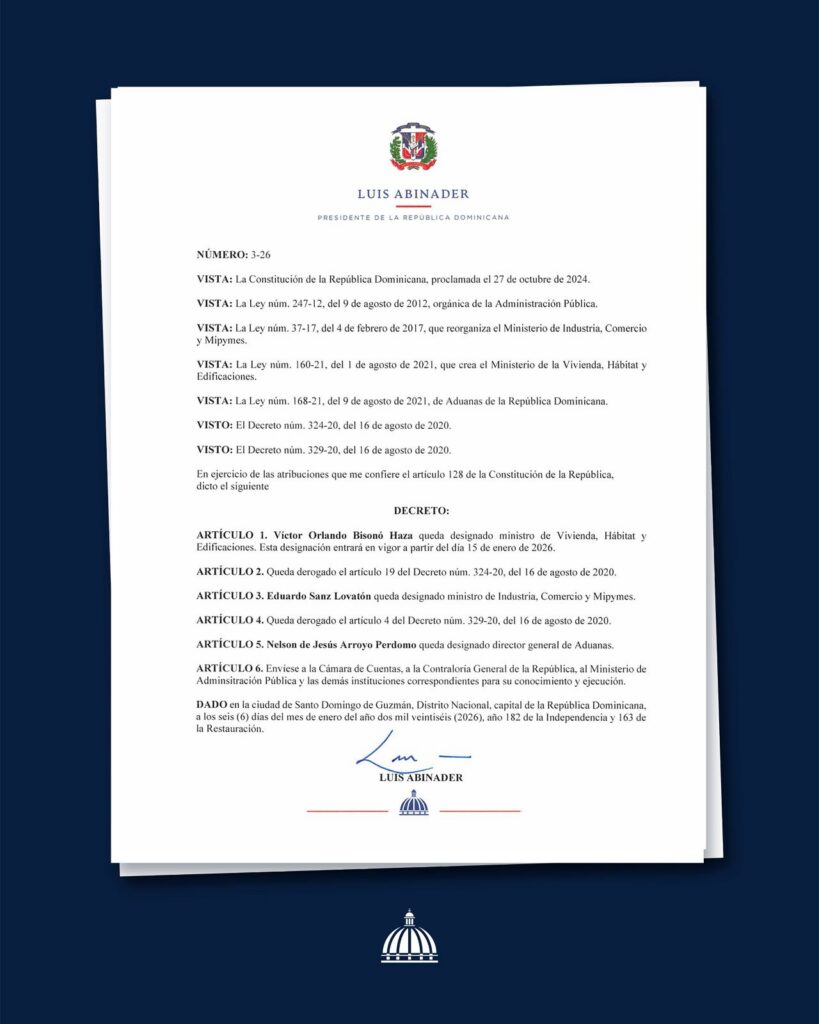 Santo Domingo: Mediante el Decreto número 3-26, el presidente Luis Abinader dispuso esta tarde, una de las últimas series de designaciones y movimientos en el tren gubernamental que viene anunciando desde la mañana de este martes. Las más recientes incluyen las direcciones de Aduanas, el Ministerio de la Vivienda, Hábitat y Edificaciones y el Ministerio de Industria, Comercio y Mipymes.