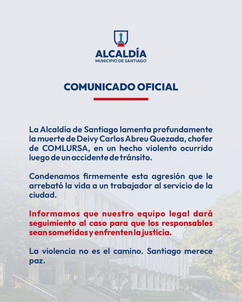 Santiago. La Alcaldía de Santiago expresó su pesar por la muerte de Deivy Carlos Abreu Quezada, chofer de la empresa recolectora de residuos, tras un hecho violento ocurrido luego de un incidente de tránsito en la ciudad.