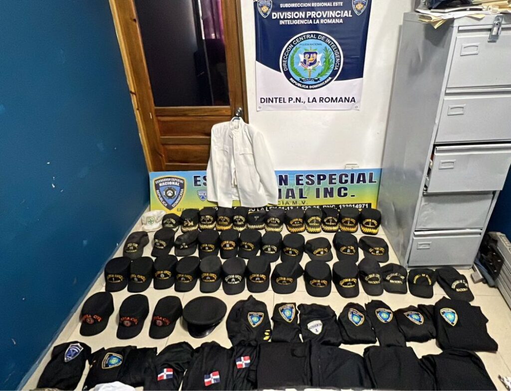 Entre las evidencias ocupadas figuran gorras con insignias de general y otros rangos, indumentarias con inscripciones del “Escuadrón Especial Nacional”, “Policía Comunitaria”, así como material logístico alusivo a una supuesta Academia de Bomberos y al Voluntariado Nacional, entre otras entidades.