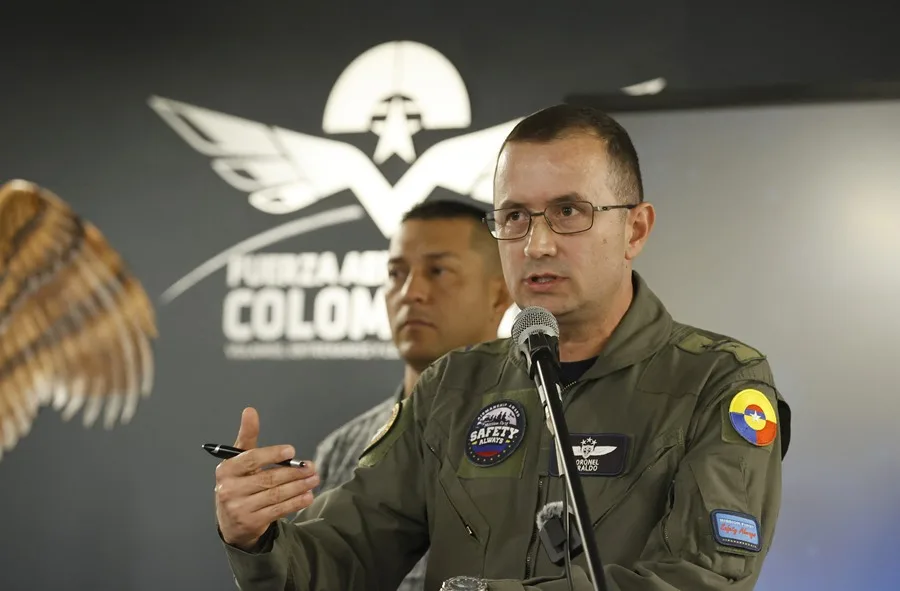 El director de Seguridad Operacional de la Fuerza Aeroespacial Colombiana (FAC), coronel Luis Fernando Giraldo, habla durante una rueda de prensa este jueves, en Bogotá (Colombia). EFE/ Mauricio Dueñas Castañeda