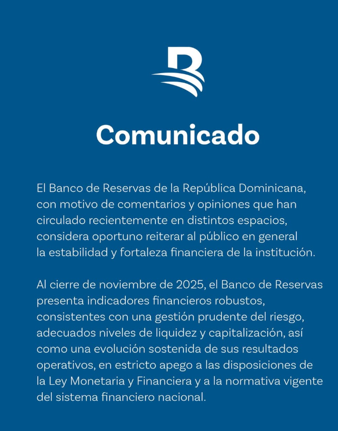El comunicado concluye que el Banco de Reservas opera bajo la supervisión permanente de las autoridades monetarias y regulatorias, garantizando el cumplimiento de los requerimientos prudenciales, la transparencia y la gestión responsable de riesgos.