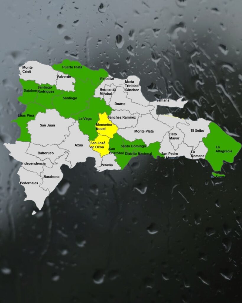Santo Domingo.-El Centro de Operaciones de Emergencias (COE) informó este lunes que mantiene dos provincias en alerta amarilla y 9 provincias y el Distrito Nacional en alerta verde por vaguada.