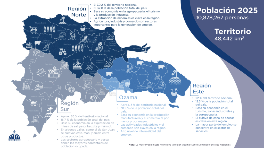 La economía dominicana no se distribuye de forma homogénea en el territorio: cada región del país concentra actividades productivas específicas que definen su aporte al empleo, la producción y el crecimiento, según su extensión territorial, población y recursos naturales.