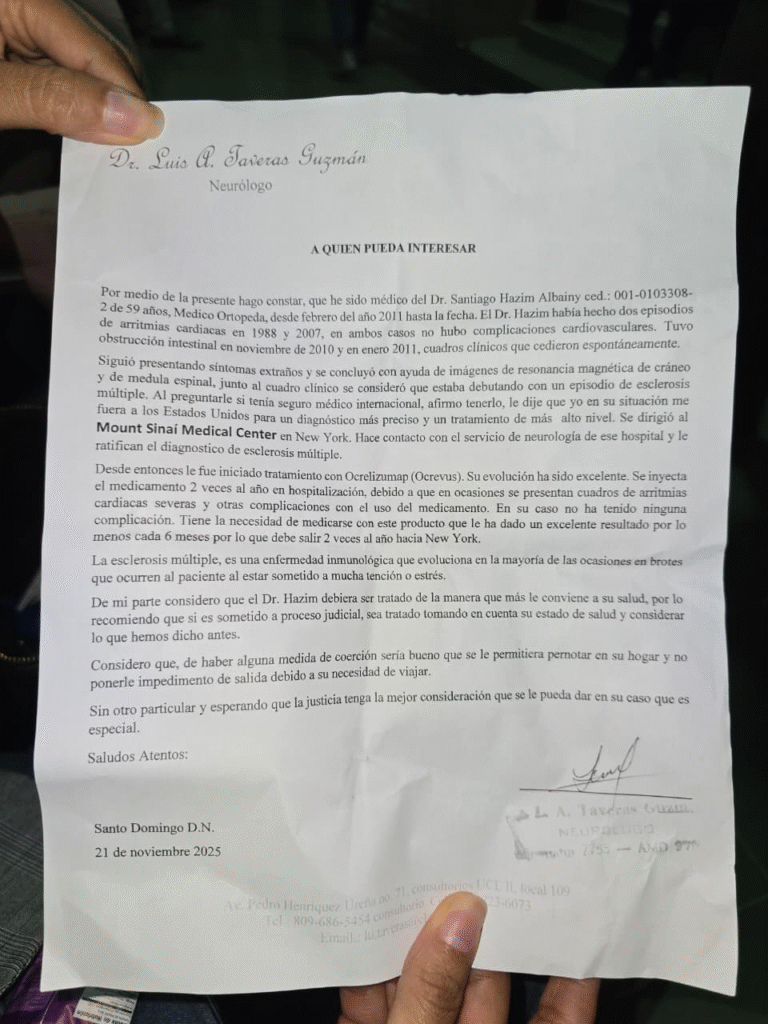 El documento, firmado por el neurólogo Luis A. Taveras Guzmán y fechado el 21 de noviembre de 2025, establece que Hazim padece esclerosis múltiple, una enfermedad inmunológica crónica que le fue diagnosticada en 2011 tras estudios realizados en el Mount Sinai Medical Center de Nueva York.