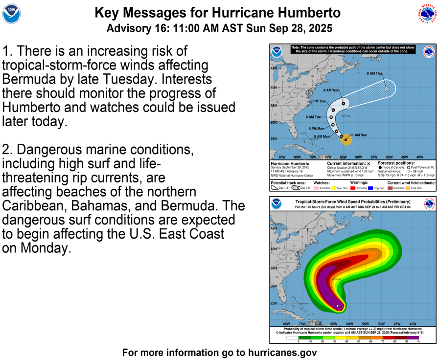 Además, el NHC alertó que el oleaje y las marejadas generadas tanto por la tormenta tropical Imelda como por Humberto producirán condiciones marítimas peligrosas y corrientes de resaca a lo largo de la costa este de Florida y Georgia hasta el lunes, extendiéndose progresivamente hacia el norte durante los próximos días.