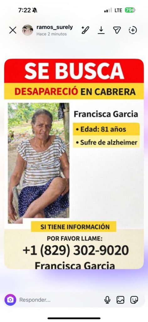 La familia pide que si ven a la señora Francisca favor contactar al (829) 302-9020.