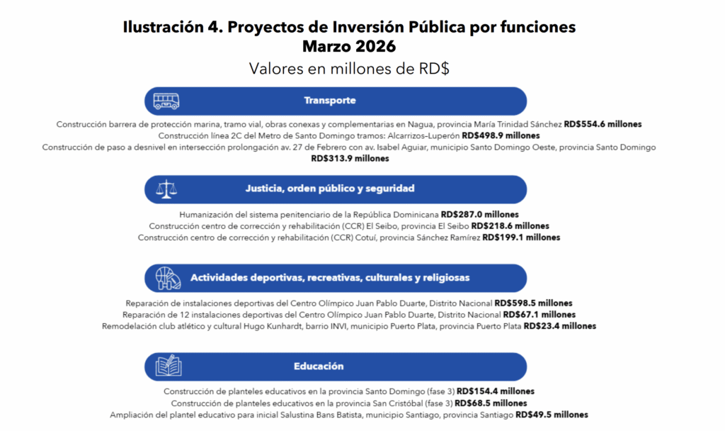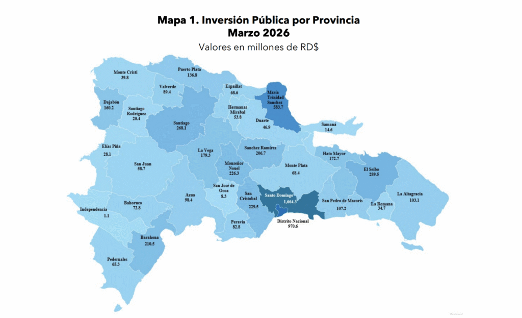 La inversión pública del Gobierno Central en la República Dominicana alcanzó RD$6,765.5 millones en marzo de 2026, concentrándose principalmente en la región Ozama o Metropolitana, lo que refleja una distribución territorial focalizada del gasto en infraestructura, según el informe de la Dirección General de Presupuesto (DIGEPRES).