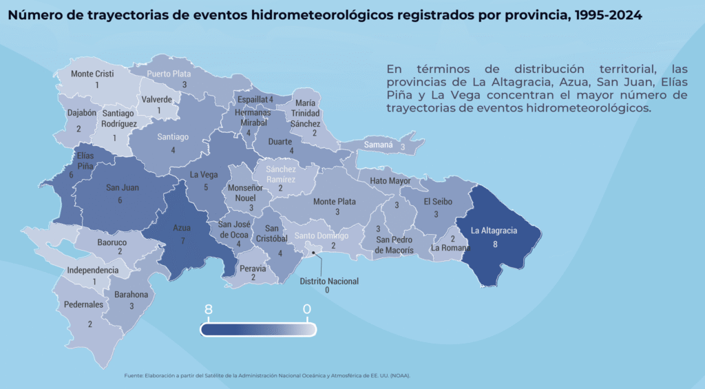 A nivel territorial, provincias como La Altagracia, Azua, San Juan, Elías Piña y La Vega registran la mayor cantidad de trayectorias de estos fenómenos. Esto sugiere que ciertas zonas del país enfrentan una exposición más recurrente a eventos climáticos.