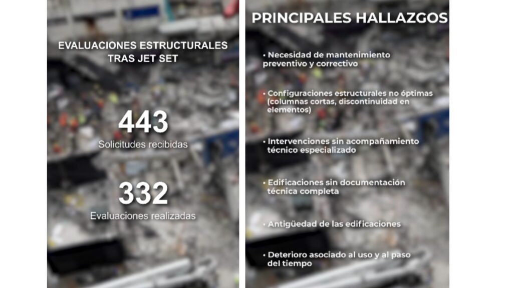 Santo Domingo. – Tras el colapso del techo de la discoteca Jet Set ocurrido en la madrugada del 8 de abril de 2025, tragedia que dejó más de 200 fallecidos y más de un centenar de heridos, entre ellos el merenguero Rubby Pérez, diversas instituciones públicas y privadas solicitaron evaluaciones estructurales revelando “recurrentes” fallas estructurales y falta de mantenimiento en las edificaciones.