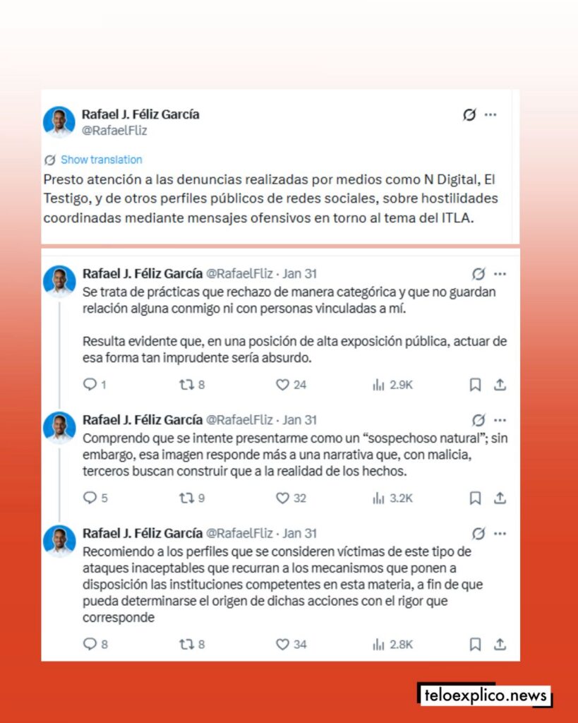 A través de varios mensajes publicados en la red social X, Féliz García indicó que ha prestado atención a las denuncias difundidas por medios como N Digital, El Testigo y otros perfiles públicos, en las que se advierte sobre presuntas campañas de ataques digitales relacionadas con el ITLA.