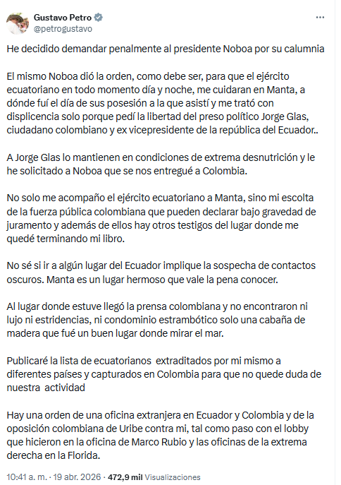 «He decidido demandar penalmente al presidente Noboa por su calumnia», escribió Petro en su cuenta de X al anunciar la acción judicial.