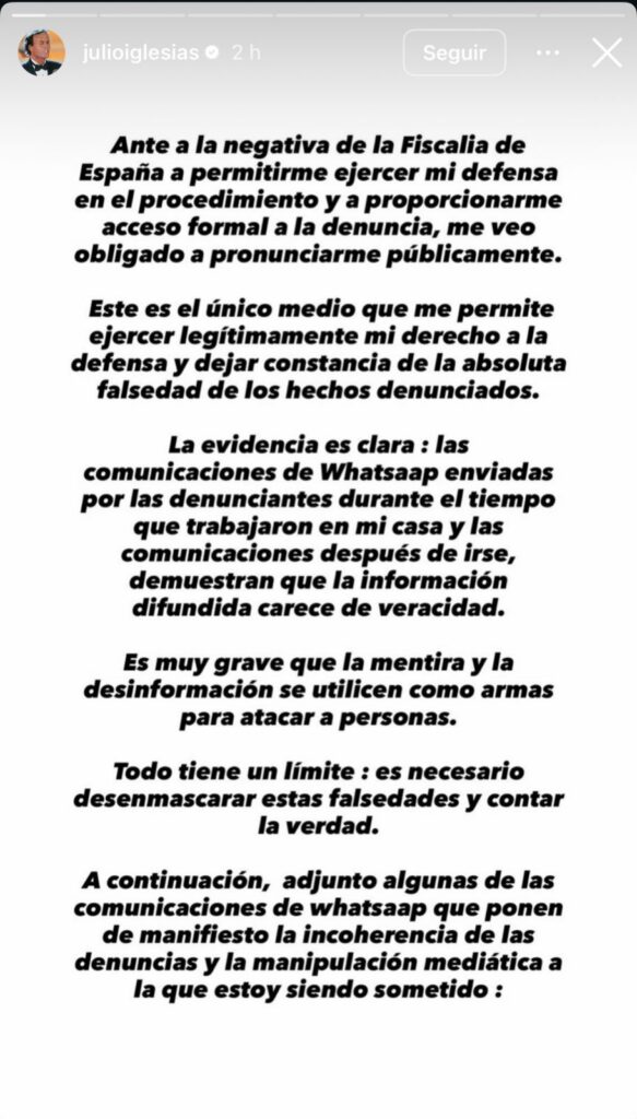 Julio Iglesias sostuvo que las comunicaciones difundidas evidencian contradicciones en los señalamientos y reiteró que continuará defendiendo su nombre y su reputación, insistiendo en que los hechos denunciados no ocurrieron.
