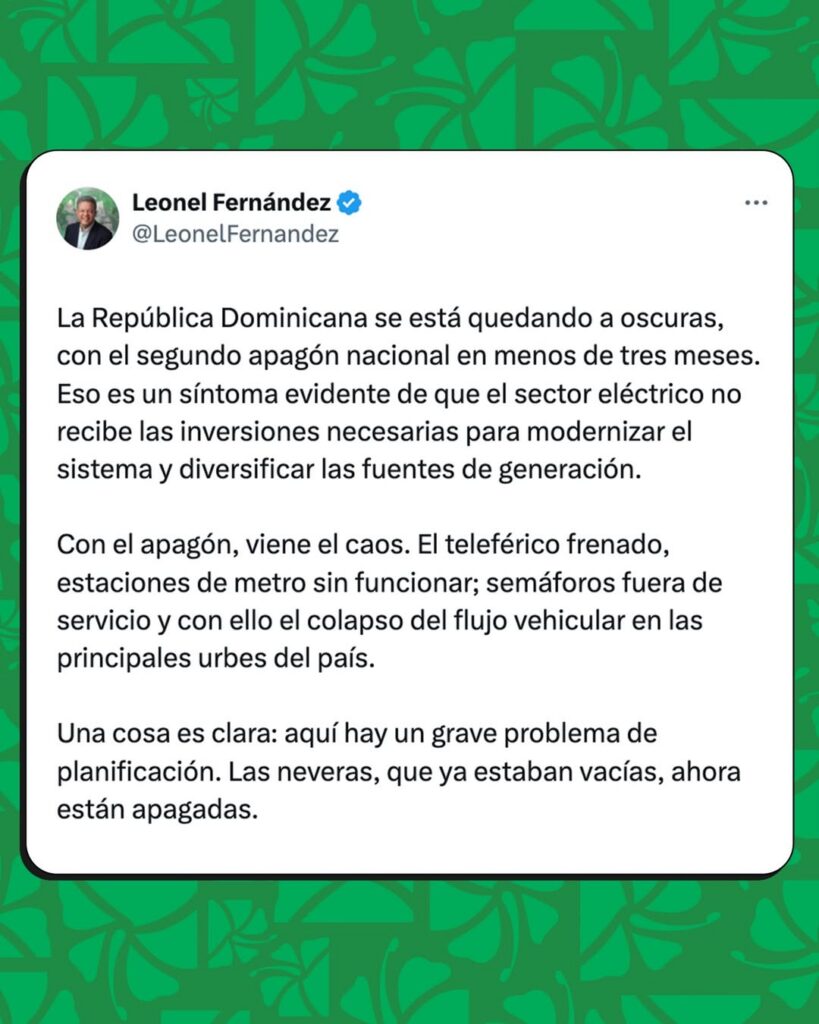 Santo Domingo. – El expresidente de la República y presidente de la Fuerza del Pueblo (FP), Leonel Fernández, arremetió contra el Gobierno tras el apagón general que afectó al país este lunes, calificándolo como un síntoma evidente de la falta de inversión y planificación en el sector.