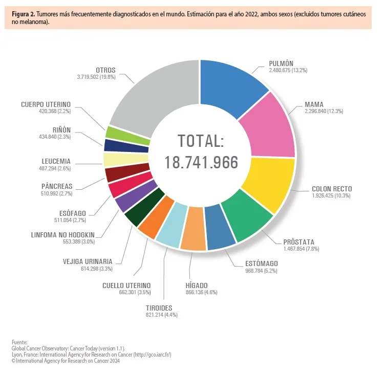 Los cánceres responsables del mayor número de fallecimientos a nivel mundial fueron el cáncer de pulmón (18,8% del total de muertes por cáncer), el cáncer colorrectal (9,3%), el cáncer hepático (7,8%), el cáncer de mama (6,9%) y el cáncer de estómago.