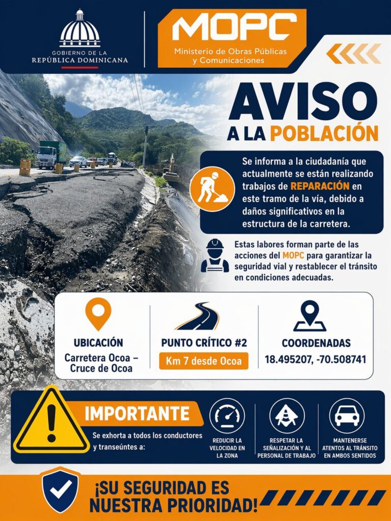 Santo Domingo.-El Ministerio de Obras Públicas y Comunicaciones (MOPC) informó que se encuentra ejecutando un plan de intervención en la carretera Ocoa – Cruce de Ocoa para solucionar daños estructurales que afectaban la seguridad del trayecto.