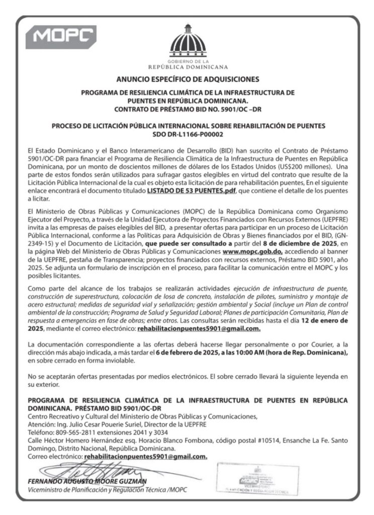 Santo Domingo. – El Ministerio de Obras Públicas y Comunicaciones (MOPC) anunció este lunes el inicio de una licitación pública internacional para la intervención 53 puentes en 15 provincias del país.