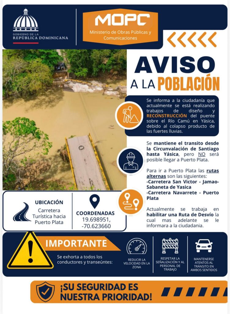 Ante esta situación, las autoridades recomendaron a los conductores utilizar rutas alternas, como la carretera San Víctor–Jamao–Sabaneta de Yásica y la vía Navarrete–Puerto Plata, mientras avanzan los trabajos.
