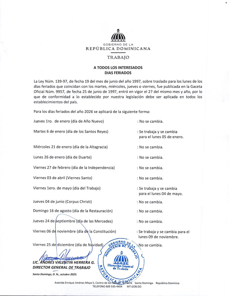 Santo Domingo.– El Ministerio de Trabajo anunció este miércoles las fechas correspondientes a los días feriados que regirán durante el año 2026, en cumplimiento de lo establecido por la Ley No. 139-97, sobre el traslado de los días festivos que coincidan con martes, miércoles, jueves o viernes.