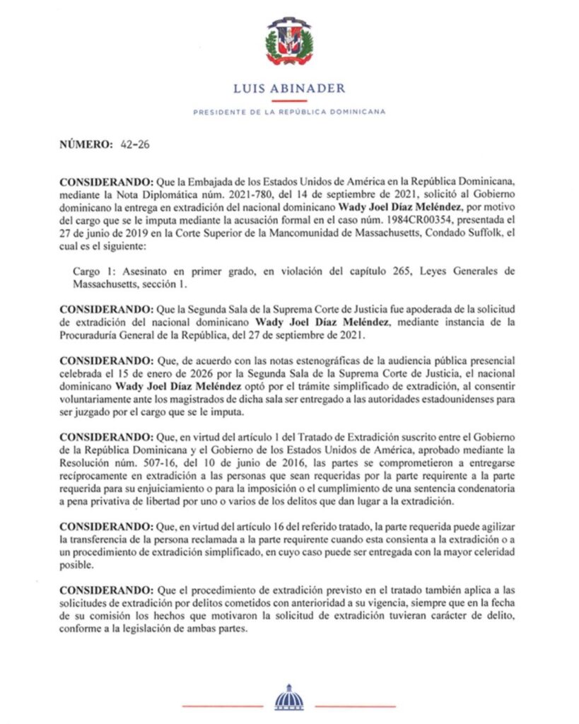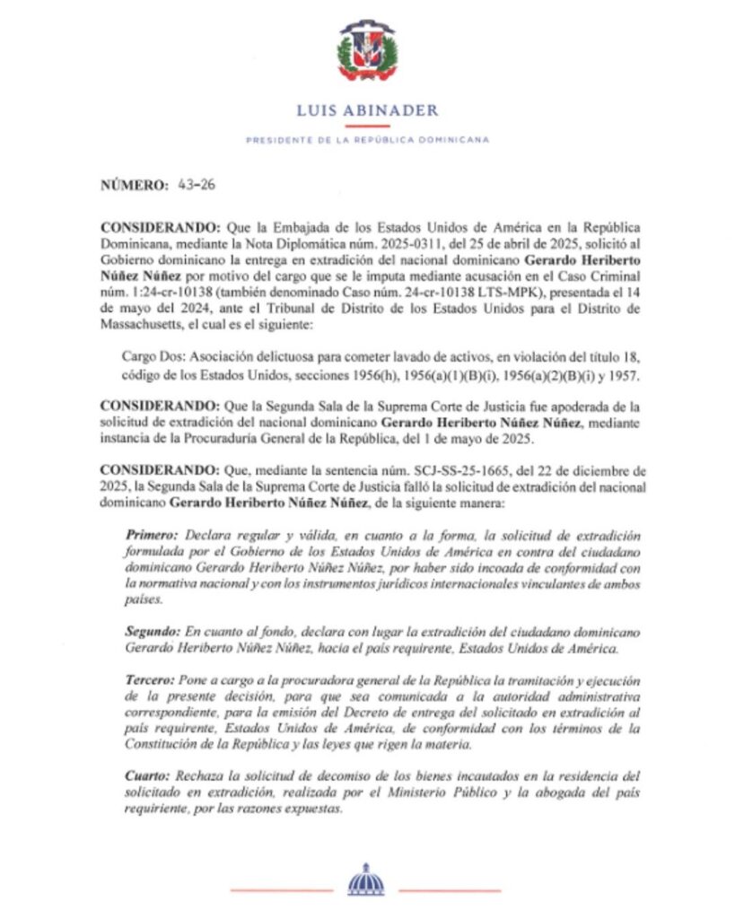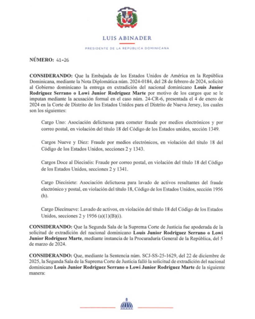 Santo Domingo.- A través de la emisión de los decretos 41-26, 42-26 y 43-26, el Poder Ejecutivo dispuso la entrega a la justicia estadounidense de los ciudadanos Louis Júnior Rodríguez Serrano (también conocido como Lowi Júnior), Wady Joel Díaz Meléndez y Gerardo Heriberto Núñez.
