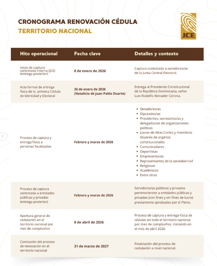 De acuerdo con el cronograma oficial, la JCE prevé concluir el proceso de renovación el 31 de marzo de 2027 en todo el territorio nacional. A partir de esa fecha, la cédula anterior perderá validez para la realización de trámites legales, bancarios, administrativos y otros procedimientos oficiales.
