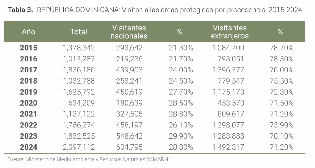 Las áreas protegidas terrestres de la República Dominicana no solo conservan biodiversidad y procesos ecológicos críticos, sino que también son destinos turísticos, educativos y de recreación. En 2024, estos espacios recibieron más de 2 millones de visitantes, lo que evidencia su relevancia cultural y económica, pero también plantea desafíos para garantizar que la interacción humana no comprometa la integridad de los ecosistemas, según datos del Ministerio de Medio Ambiente.