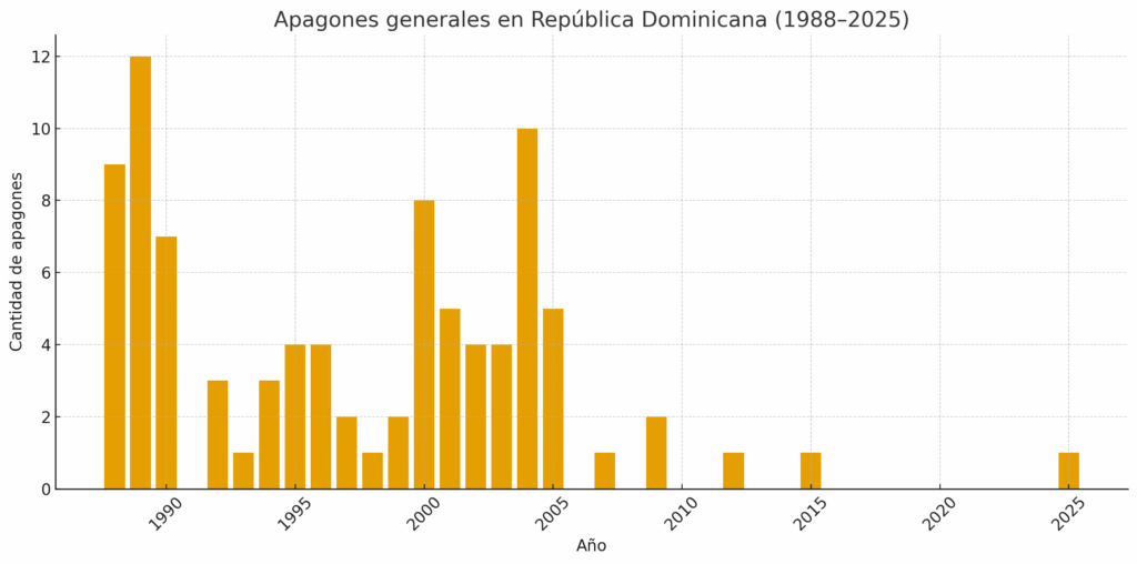 Durante las décadas de 1980 y 1990, los apagones generales eran frecuentes. En 1988 se produjeron nueve eventos, mientras que 1989 fue el año más crítico con doce apagones, todos sin explicación técnica precisa. En contraste, entre 2015 y 2025 solo se han reportado dos apagones nacionales, ambos asociados a problemas en los sistemas de protección del SENI.