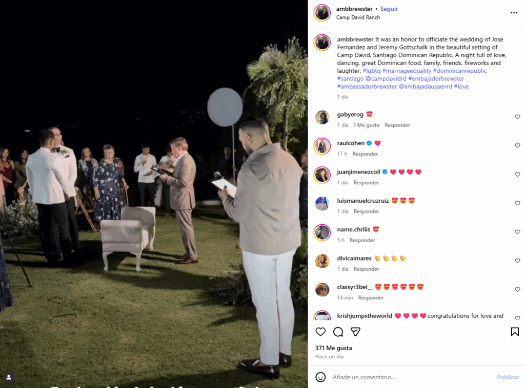 Brewster, quien se desempeñó como embajador entre 2013 y 2017, compartió fotografías y mensajes en los que calificó la ceremonia como “una noche llena de amor, baile, comida dominicana, familia, amigos, fuegos artificiales y risas”, acompañadas de etiquetas alusivas a la igualdad matrimonial y la comunidad LGBTQ+.
