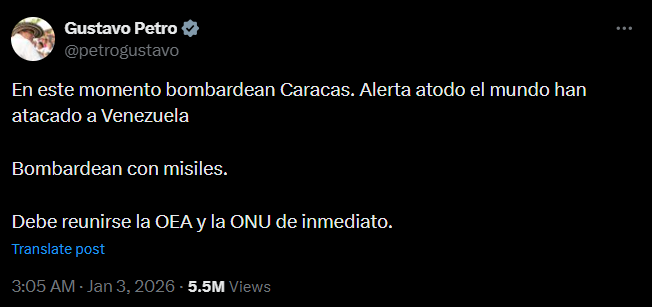 Previamente, el gobernante colombiano aseguró que Caracas estaba siendo bombardeada y señaló que la Organización de Estados Americanos (OEA) y la ONU «deben reunirse de inmediato» para abordar la situación, pero sin mencionar a Estados Unidos.