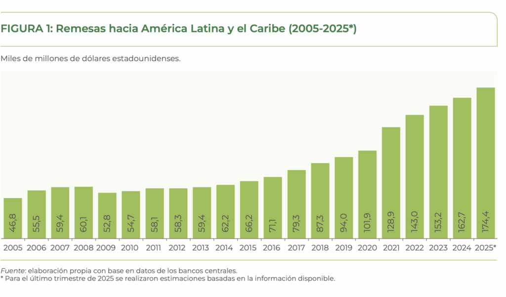 El comportamiento de las remesas en 2025 refleja un patrón de crecimiento que se ha mantenido de manera continua durante 16 años en América Latina y el Caribe (ALC). La región en su conjunto recibirá aproximadamente US$174,400 millones, US$11,700 millones más que en 2024, con una tasa de crecimiento de 7.2% respecto al año anterior. Este aumento revierte parcialmente la desaceleración observada desde 2021 y responde a la reacción de los migrantes ante incertidumbres económicas en sus países de residencia.