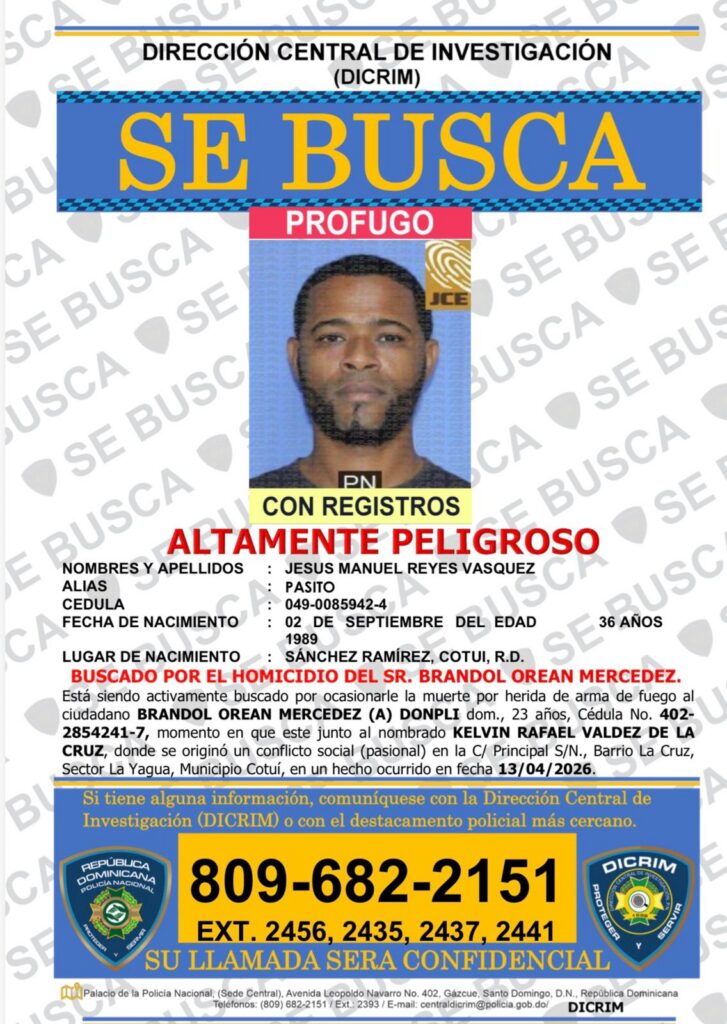 Cotuí. – Jesús Manuel Reyes Vázquez, alias “Pasito”, se entregó a la Policía Nacional tras ser buscado por su presunta implicación en el homicidio del joven Brandol Orean Mercedes, de 23 años, ocurrido el pasado 13 de abril en el sector La Yagua del municipio de Cotuí.