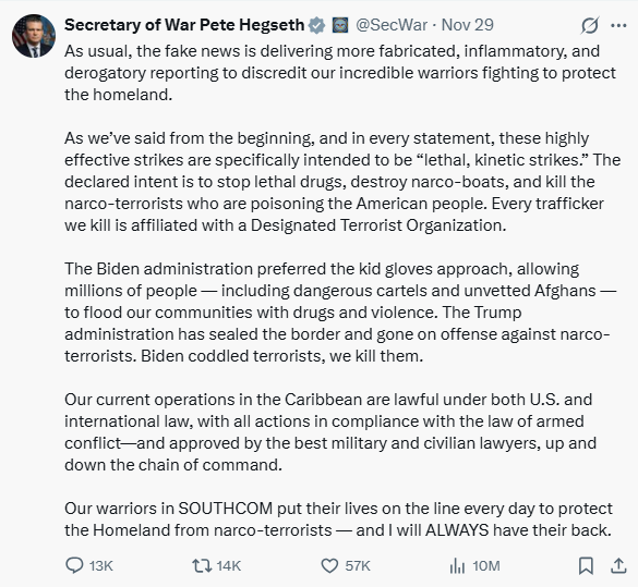 Hegseth acusó a la prensa de divulgar reportes “fabricados, inflamatorios y despectivos” con el propósito de desacreditar a los militares estadounidenses involucrados en estas operaciones. Sostuvo que los ataques llevados a cabo por las fuerzas estadounidenses han sido diseñados como “ataques letales y cinéticos”, con el fin de frenar el flujo de drogas, destruir embarcaciones utilizadas por narcotraficantes y eliminar a individuos identificados por Washington como “narco-terroristas”. Aseguró que “cada traficante que matamos está afiliado a una Organización Terrorista Designada”.