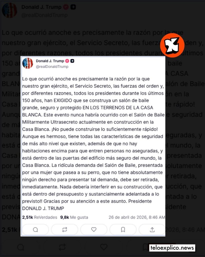 A través de su red social Truth, el mandatario defendió la construcción de un salón de eventos de alta seguridad dentro del perímetro de la residencia presidencial, el cual calificó como un proyecto «militarmente ultrasecreto».