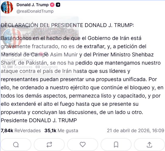 Pese a la tregua, la postura de la administración estadounidense sigue siendo firme. Trump advirtió que retomará los bombardeos si no se logra un acuerdo definitivo, manteniendo además el bloqueo naval contra los puertos iraníes.