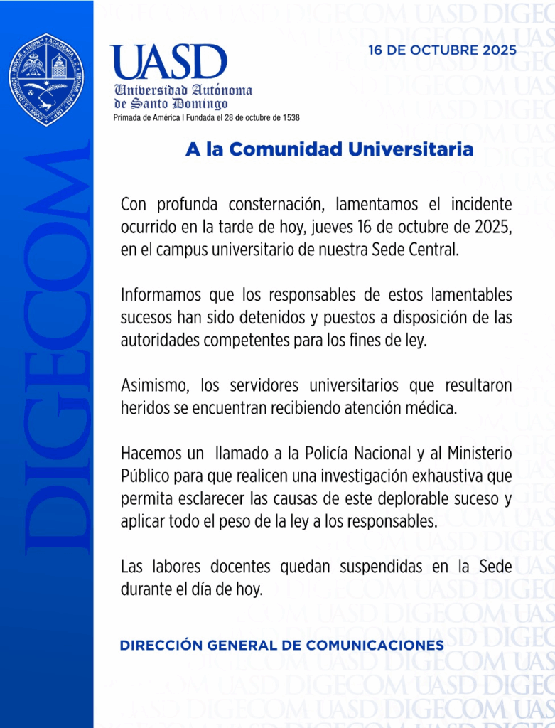 La Policía Nacional informó más temprano que fue detenido Alexander Jiménez Galván, de 35 años y residente en Santo Domingo Oeste, señalado como presunto autor del ataque. La captura, según el informe policial, se produjo momentos después del suceso con la colaboración de personal de la universidad.