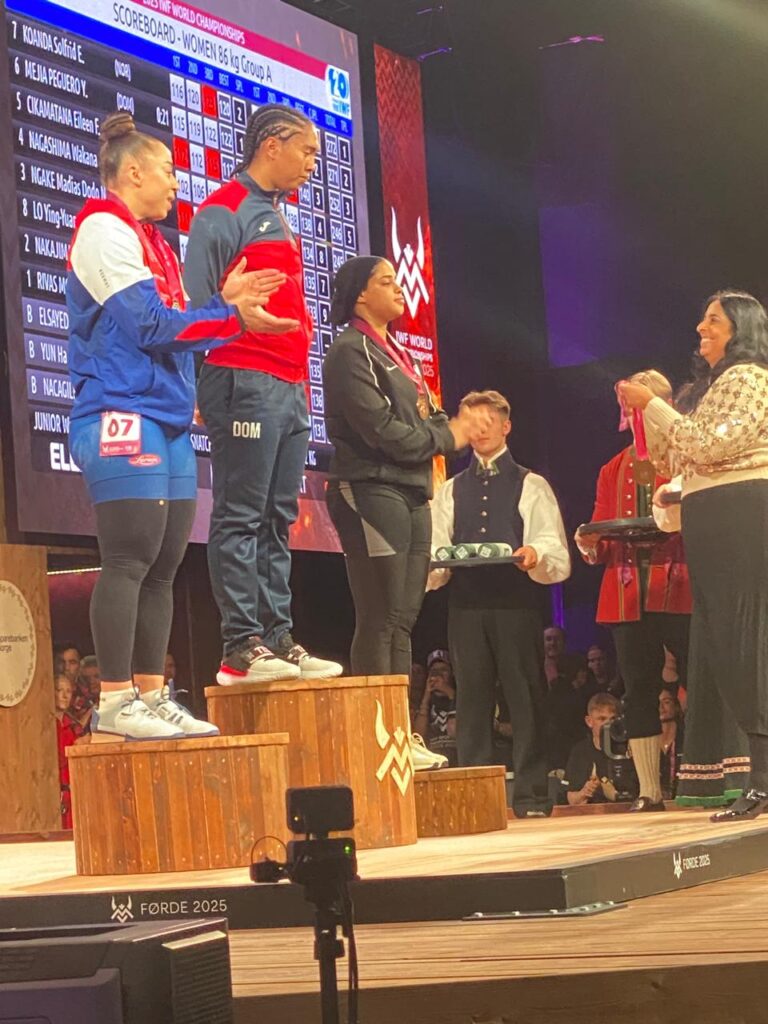 La hazaña reviste un mayor relieve al ser además la primera pesista que consigue tres medallas mundiales, al sumar plata y bronce en las tres modalidades: arranque, envión y total.